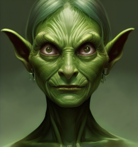 Aussehen: Klein, Grün, trägt Altdamenmode und ihren eigenen Schmuck.