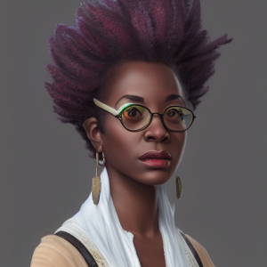 Aussehen: Mittelalte, dunkelhäutige Dame mit wildem Haar, edlen Outfits und traditionellen Accessoires.